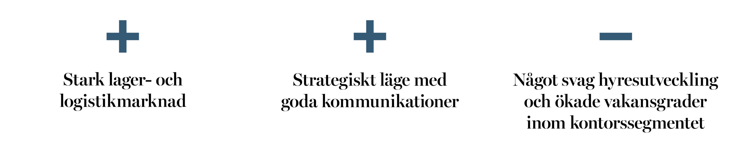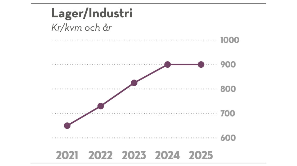 Även under 2024 har nya spekulativa byggstarter genomförts, vilket signalerar stark framtidstro trots ökade vakanser på riksnivå. Hyresnivåerna för moderna lagerlokaler i A- och B-lägen ligger i spannet 650–850 kronor per kvadratmeter, medan direktavkastningskraven varierar från cirka 5,75–6,75 procent för nya objekt. De äldre bedöms ligga på 7,25–8,25 procent.