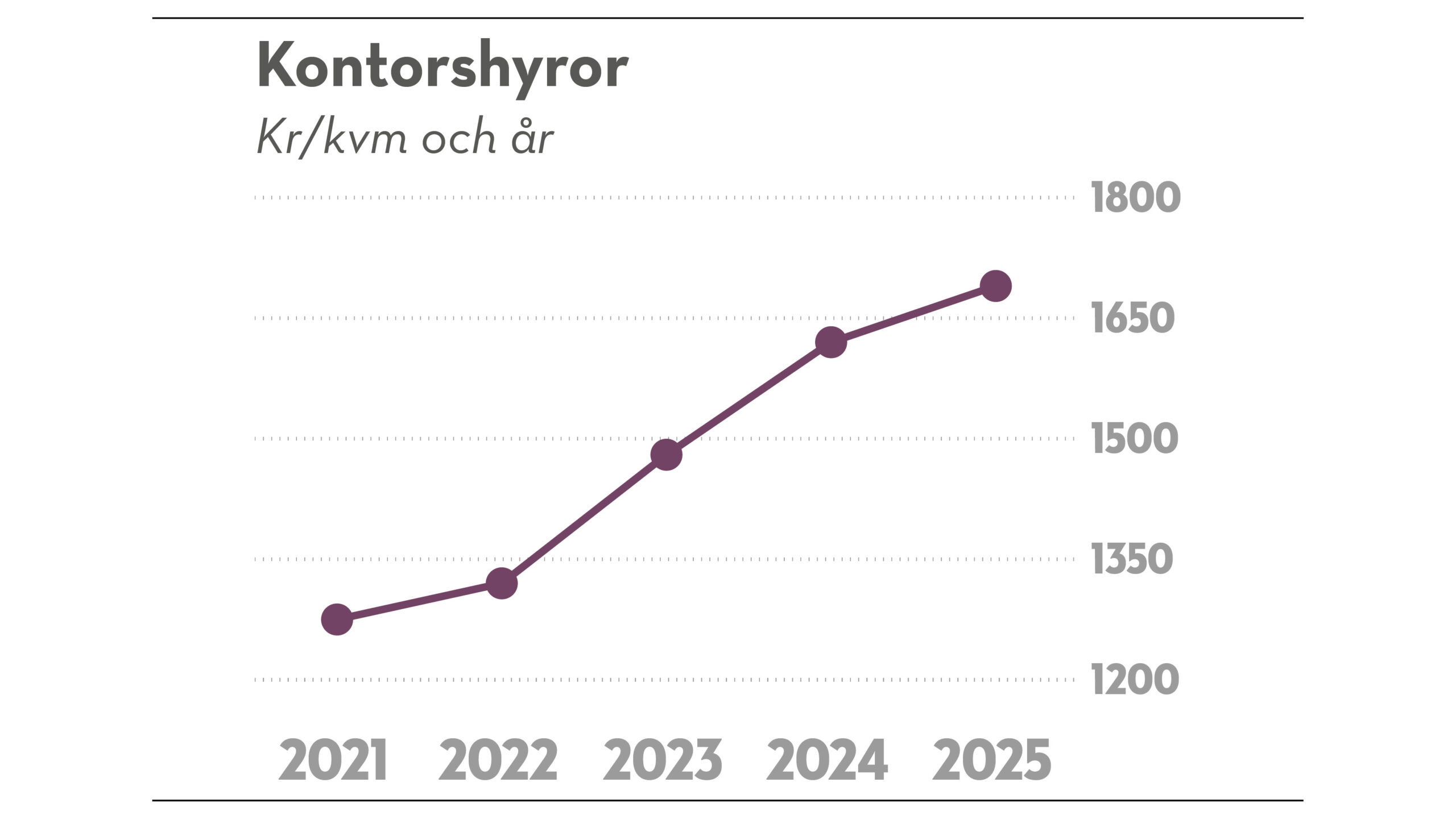 Det befintliga kontorsbeståndet består till stor del av ombyggda lokaler från 60- till 80-talet. Hyresnivåerna i A-lägen ligger mellan 1 400–1 800 kronor per kvadratmeter, vilket ofta inte räcker för att motivera spekulativa nybyggen. Efter pandemin har efterfrågan på moderna, energieffektiva lokaler ökat – men prispressen bromsar omställningen.