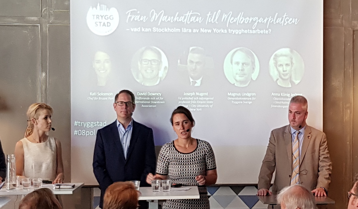 Under 2017 rapporterades 290 mord i New York. Med svenska mått mätt är detta en mycket hög siffra, jämfört med Sverige som hade 113 fall av dödligt våld i hela landet under samma period. Men när det gäller New York är det en historiskt låg siffra, och delvis en följd av implementeringen av business improvement districts (BID) i staden. Det menar åtminstone de tre New York-bor som var inbjudna till ett frukostseminarium av Moderaterna i Stockholm: före detta New York-polisen och professorn, Joseph Nugent, David Downey vd för Downtown association samt Kati Solomon, chef för Bryant park i New York.
