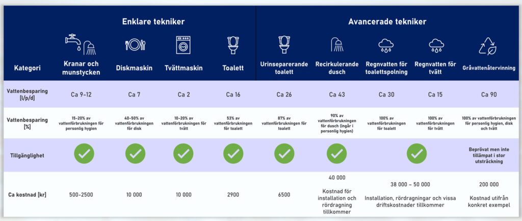 Det går att göra i redan befintliga byggnader. Lite mer avancerat är att med regnvatteninsamling ersätta cirka 70 procent av toalettspolningsvattnet. Eller återcirkulerat vatten från dusch och handfat som har en vattenbesparande potential på drygt 54 liter per person och dygn.