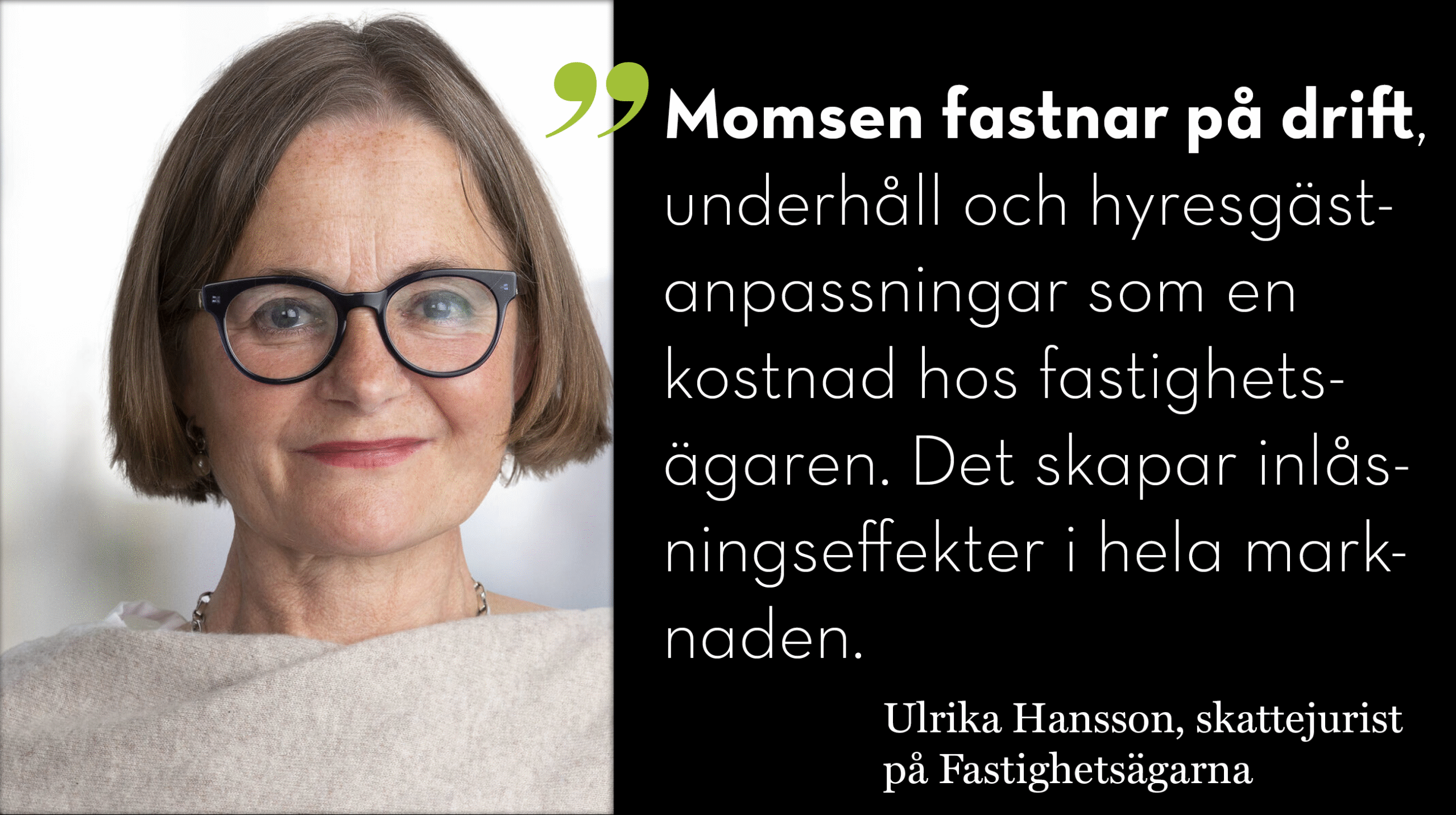 – I dag kan en fastighetsägare inte momsbelägga lokalhyra om hyresgästen saknar avdragsrätt för moms. Då fastnar momsen på drift, underhåll och hyresgästanpassningar som en kostnad hos fastighetsägaren. Det skapar inlåsningseffekter i hela marknaden. Det är så helt uppenbart att man måste kunna använda fastigheterna mer resurseffektivt i dag, säger Ulrika Hansson.