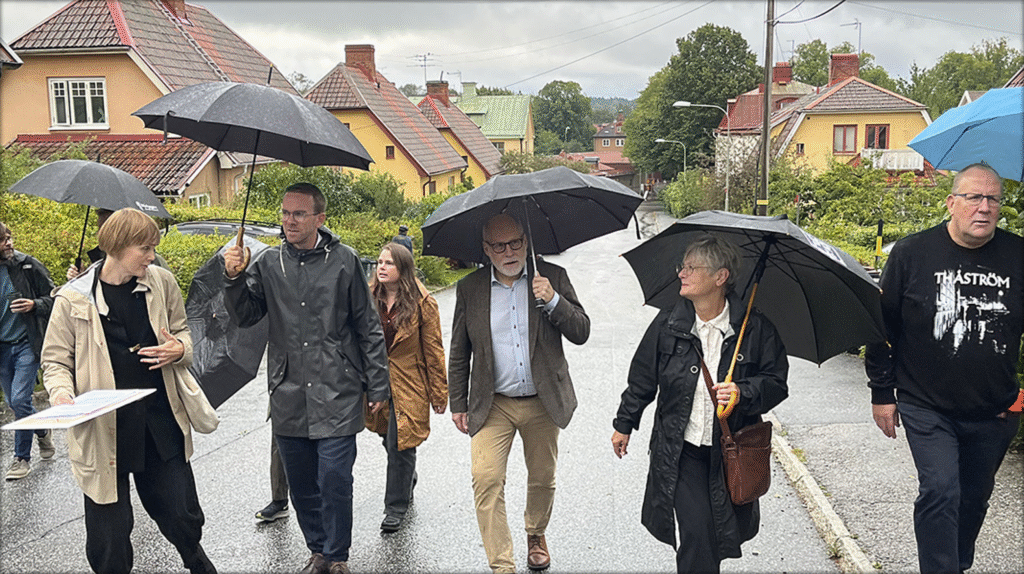 Hyresgästföreningen har bjudit in till en stadsvandring i Stockholmsförorten Gamla Enskede. Det regnar. Vi – några journalister, tjänstemän från Regeringskansliet och företrädare för Hyresgästföreningen – står samlade på det trivsamma torget utanför Konsumentföreningen Thules vackra byggnad från 1913, som nu rymmer ett café.